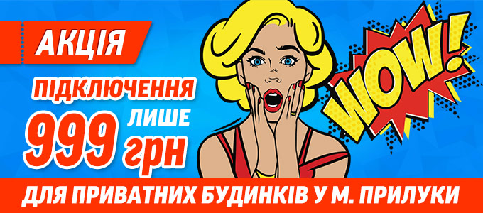 F.A.Q. (відповіді на поширені запитання)Питання: Мені повідомили, що вартість підключення до інтернету мого будинку коштує 2550 грн. Чи можу я скористатися Акцією?Відповідь: Так. Вартість підключення буде знижена на 1026 грн., тобто Ваша вартість підключення буде 1524 грн. Питання: Розмір знижки стосується будь-якої вартості підключення?Відповідь: Так, розмір знижки однаковий для всіх - 1026 грн., але повна вартість підключення не повинна перевищувати 4000 грн. У випадку, якщо вартість перевищує 4000 грн. скористатися акцією не можливо. Питання: Я проживаю в селі Дідівці, Прилуцького району. Чи можу я скористатися цією акцією?Відповідь: Вибачте, ні. Акція розповсюджується тільки на м. Прилуки.