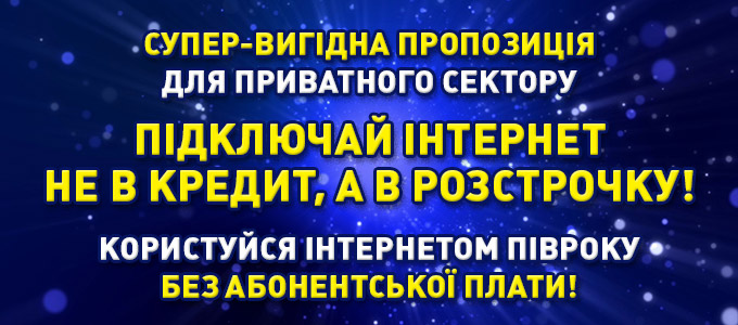 Новини: Акція! Підключай Інтернет не в кредит, а в розстрочку!31.12.2015 | Переглядів: 8022Хочеш інтернет не в кредит, а в розстрочку? Тоді не лови гав...1. Подай заявку на прорахунок вартості підключення, результат буде відомий вже через добу. 2. Влаштовує ціна — дій далі. Завітай в технічний відділ, вул. Ю. Коптєва 72, каб. 203 і надай свої дані для оформлення запиту на розстрочку. Через пару годин результат буде відомий і щойно буде отримано позитивну відповідь процес підключення буде розпочато. 3. Контролювати процес підключення і отримувати інформацію по вашій заявці Ви зможете за телефонними номерами технічної підтримки в будь-який зручний для Вас час. 4. І в заключення приємний бонус, півроку ніякої абонплати. Досить ловити гав, дій — не пожалкуєш!Деталі за телефоном 7-13-13 |