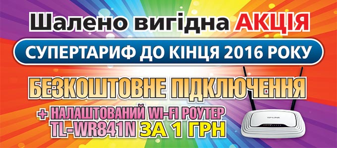 Новини: Супер-тариф на 2016 рік + роутер за 1 грн30.05.2016 | Переглядів: 8977Поспішай стати новим абонентом ТІМ-Інтернет та отримай в подарунок Супер-тариф на весь 2016 рік — швидкість до 100 Мбіт / сек лише за 70 грн / міс. Підключення безкоштовне. Також пропонуємо налаштований Wi-Fi роутер TP-Link TL-WR841N за 1 грн. Акція діє тільки для м. Прилуки до 1 серпня 2016 року! |